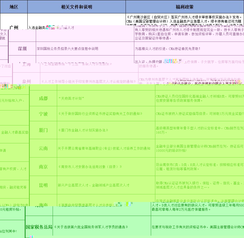 CMA被公認為國際财經領域的黃金标準,有國際财務界的“Mini-MBA”之稱,是企業的“戰略軍師”。近些年,越來越多的企業在招聘财務人員時都明确顯示CMA優先,比如阿裡巴巴、華瑞怡寶、施耐德電氣(中國)有限公司、星巴克等等。各大城市也紛紛把CMA納入當地高層次人才庫入選條件,現金獎勵、住房補貼、子女入學、醫療保健等豐厚的福利待遇。