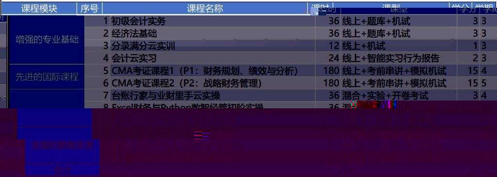 4、授課内容:主要包括“增強的專業基礎”、“先進的國際課程”、“紮實的數智技能”和“全面的數智實務”四大部分。課程大綱如下表所示: