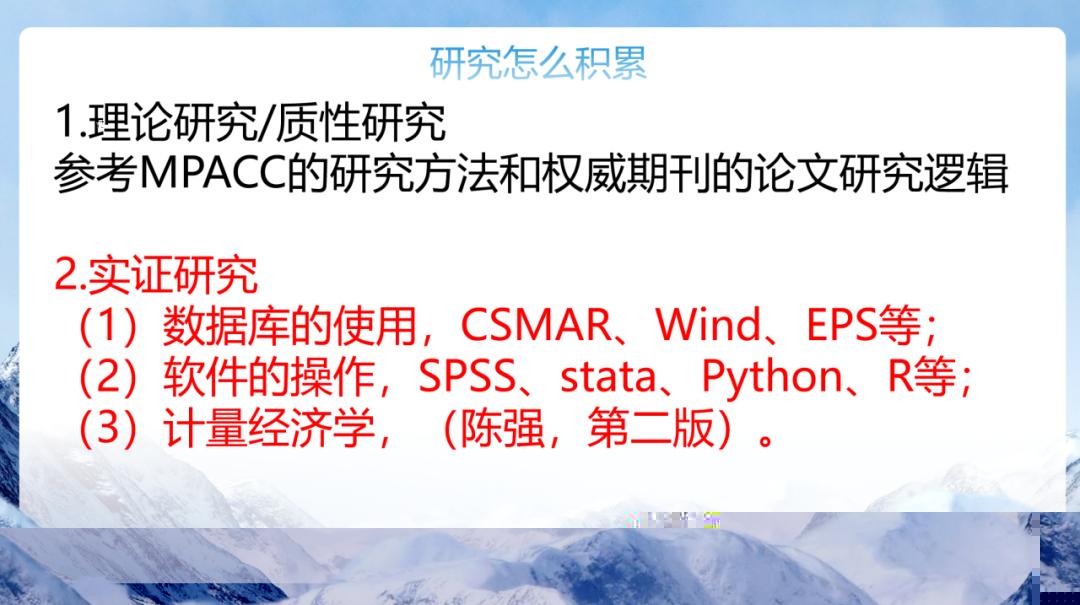 李亞超老師向我們介紹了幾種不同的研究方向——案例研究與田野研究,即理性與質性的研究;實證研究,即結合互聯網工具為輔進行話題研究。同時,他列舉了一些較為熱門的研究選題,如數字化轉型相關研究、ESG與環境資源會計相關研究、審計相關問題研究等等,使同學們更加有論文撰寫的清晰方向。